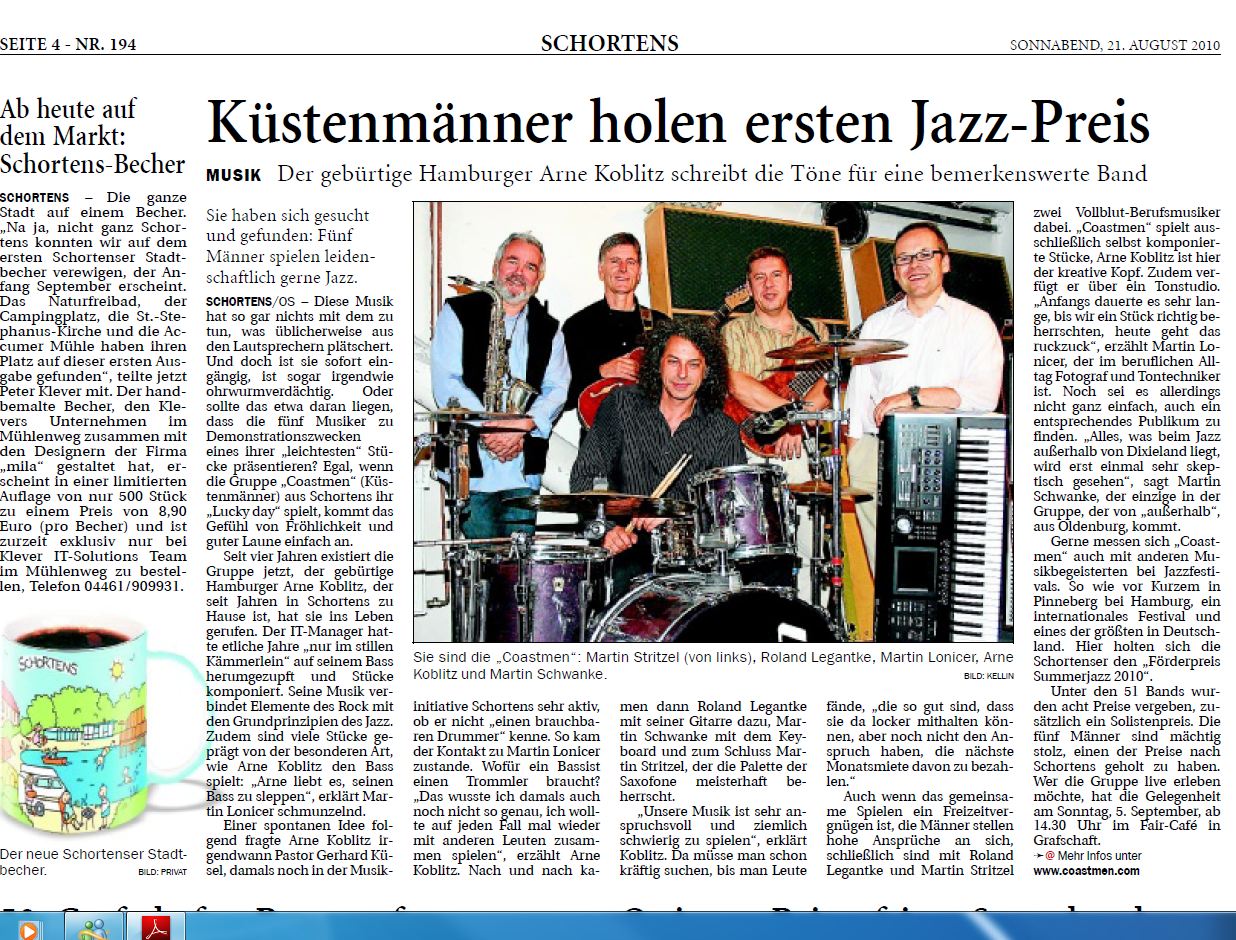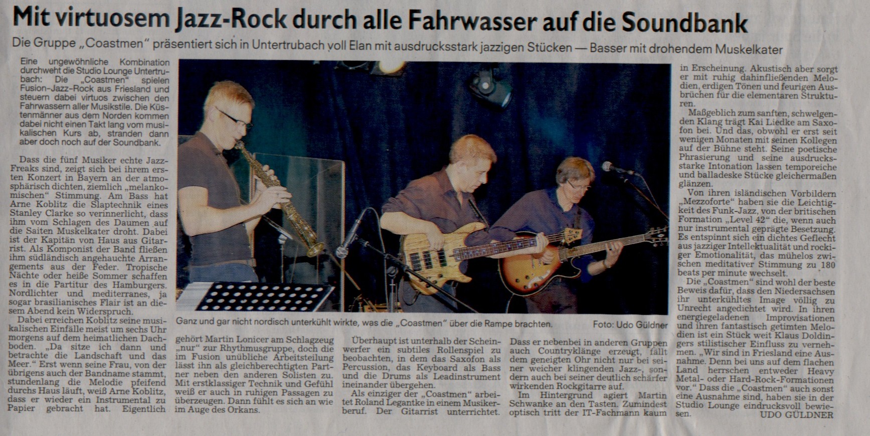 ... Coastmen ist für mich das Synonym für klare Linien und unverwechselbaren Sound. Groovig und virtuos, gelungene leise Passagen, die viel Dynamik besitzen und absolut ausgefeilte Soli aber auch mal Rockiges und vor allem der präzise Bass von Herrn Koblitz machen Jazz auch für Leute wie mich, die bisher mit dieser Art Musik nicht viel anfangen konnten, zu einem ganz besonders schönen Erlebnis. Seit dem Gig am 1. März 2009 weiß ich, daß ich keinen Auftritt verpassen werde. Macht weiter so. Danke Euer Marc